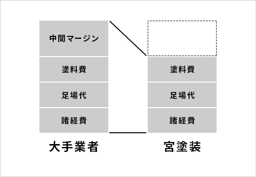 当方は、お問い合わせからアフターフォローまで一貫して自社で行っています。大手業者との違いは、下請け業者に外注しないことです。そのため、余分な中間マージンが発生せず、適正価格での施工が可能になります。
